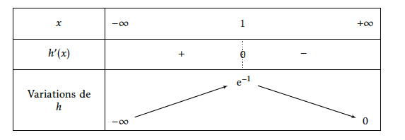 D’après le tableau de variation de la fonction $h$, cette distance est maximale pour $x=1$ et cette distance maximale vaut $\text{e}^{-1}$