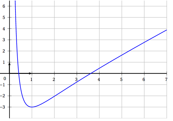 - Prouver que l'équation $f(x) = 0$ admet une unique solution $\alpha$ sur $]0~;~1]$. Déterminer à la calculatrice une valeur approchée de $\alpha$ à $10^{-2}$ près. On admettra que l'équation $f(x) = 0$ a également une unique solution $\beta$ sur $[1~;~+ \infty[$ avec $\beta \approx 3,61$ à $10^{-2}$ près.