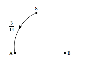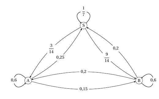 - On note $p$ la probabilité qu'un joueur solitaire un jour donné passe dans l'équipe A le jour suivant. Justifier que $p = \dfrac{3}{14}$. Un joueur solitaire garde ce statut le jour suivant avec une probabilité de $\dfrac{1}{7}$;il rejoint l’équipe B avec une probabilité $3$ fois plus élevée que celle de rejoindre l’équipe A.