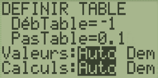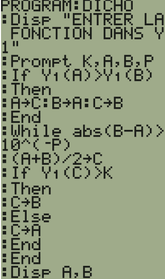 On cherche un encadrement à $10^{-p}$ de la solution de l'équation $f(x)=k$ sur un intervalle $\big[a~;~b\big]$ après s'être assuré que $k$ se trouve entre $f(a)$ et $f(b)$ : $$\begin{array}{|l|l|} \hline \text{Entrée}& \\ \text{Algorithme}& \text{Commentaires} \\ \hline \text{ Saisir } a text{ et } b & \text{ On entre les bornes de l'intervalle }\\ \text{ Saisir } k & \\ \text{ Saisir } p & \text{ On entre la précision }\\ & \\ \text{ Si } f(a)>k \text{ alors } & \\ c \text{ prend la valeur } a & \text{Si } f \text{ est décroissante }\\ a \text{ prend la valeur } b & \text{On permute les bornes de l'intervalle }\\ b \text{ prend la valeur } c & \\ \text{FinSi} & \\ \text{Tant que } \big|b-a \big|> 10^{-p}\qquad \qquad & \\ c \text{ prend la valeur } (a+b)/2 & \text{ On partage l'intervalle en deux }\\ \text{Si } f(c)< k \text{ alors } & \text{On détermine le nouvel intervalle} \\ a \text{ prend la valeur } c & \text{ contenant la solution}\\ \text{Sinon } & \\ b \text{ prend la valeur } c & \\ \text{Finsi } & \\ \text{FinTantQue } & \\ & \\ \text{ Afficher } a \text{ et } b & \text{ On affiche l encadrement }\\ \hline \end{array}$$ Voici le programme sur TI83 et sur Graph 85: