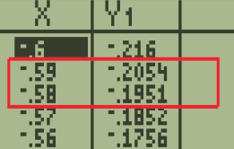 On en déduit que la solution se trouve entre $-0,59$ et $-0,58$ car $f(-0,59) < -0,2 < f(-0,58) $.