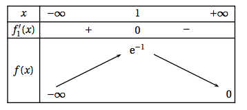 Comme la fonction exponentielle est strictement positive sur $\mathbb{R}$ ; le signe de $f_1′(x)$ ne dépend que de celui de $1-x$. On obtient donc le tableau de variations suivant :