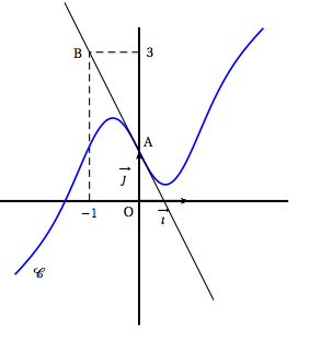 Sur le graphique ci-dessous, on a tracé, dans un repère orthonormé $\left(\text{O},~\vec{i},~\vec{j}\right)$, une courbe $\mathcal{C}$ et la droite (AB) où A et B sont les points de coordonnées respectives $(0~;~1)$ et $(-1~;~3)$.