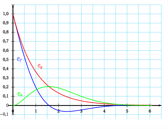 On considère les fonctions $f$ et $g$ définies sur l'intervalle $[0~;~+ \infty[$ par: \[f(x) = \text{e}^{-x} \cos(x)\quad \text{et}\quad g(x) = \text{e}^{-x}.\] On définit la fonction $h$ sur $[0~;~+ \infty[$ par $h(x) = g(x) - f(x)$. Les représentations graphiques $\mathcal{C}_f,\mathcal{C}_g$ et $\mathcal{C}_h$ des fonctions $f,g$ et $h$ sont données, en annexe, dans un repère orthogonal.