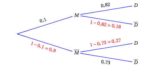D’après la formule des probabilités totales, on a alors :$\begin{align*} p(D)&=p(M\cap D) + p\left(D \cap \overline{M}\right) \\\\