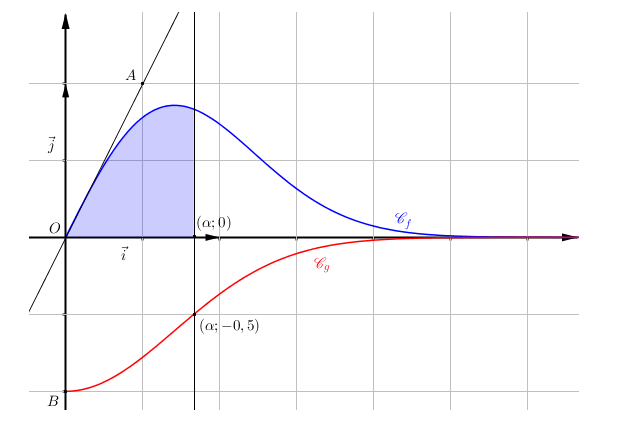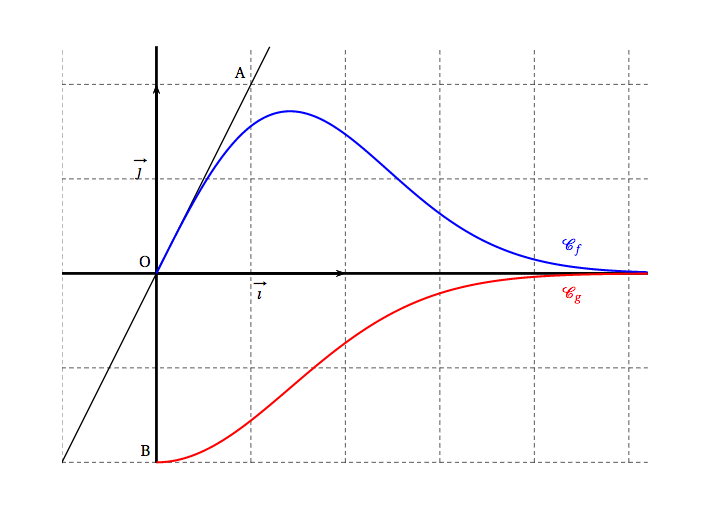 Les courbes $\mathcal{C}_f$ et $\mathcal{C}_g$ données en annexe 1 sont les représentations graphiques, dans un repère orthonormé $\left(\text{O},~\vec{\imath},~\vec{\jmath}\right)$, de deux fonctions $f$ et $g$ définies sur $[0~;~+ \infty[$. On considère les points A(0,5 ; 1) et B$(0 ; -1)$ dans le repère $\left(\text{O},~\vec{\imath},~\vec{\jmath}\right)$. On sait que O appartient à $\mathcal{C}_f$ et que la droite (OA) est tangente à $\mathcal{C}_f$ au point O.