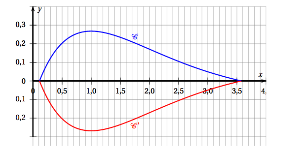 $f \left(\frac{\sqrt{2}}{2} \right)=2\times \frac{\sqrt{2}}{2} \text{e}^{-\frac{1}{2}}= \sqrt 2 \times \frac{1}{\text{e}^{\frac{1}{2}}}= \sqrt{\frac{2}{\text{e}}} $ - La fonction $g$ dont la courbe représentative $\mathcal{C}_g$ passe par le point B$(0~;~-1)$ est une primitive de la fonction $f$ sur $[0~;~+ \infty[$.