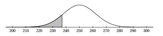 - On donne $P(X \leqslant237)=0,14$. Calculer la probabilité de l'évènement « la masse de la barquette est comprise entre 237 et 263 grammes ».