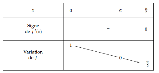 Ainsi la dérivée de $f$ est strictement négative sauf en des valeurs isolées où elle s'annule, donc $f$ est strictement décroissante sur $\left[0; \dfrac{\pi}{2}\right]$.
