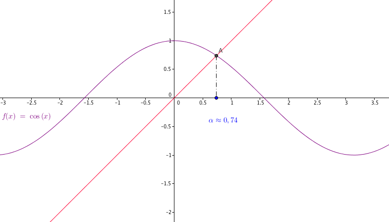 - Montrer que l'équation $(E)$ a une solution unique $\alpha$ dans $\mathbb{R}$ . Déjà si $(E)$ a une solution alors celle-ci est nécessairement dans l'intervalle $\left[0; \dfrac{\pi}{2}\right]$. $$(E) \Leftrightarrow \cos x - x=0$$ Notons $f$ la fonction définie sur $\left[0; \dfrac{\pi}{2}\right]$ par $f(x)= \cos x - x $
