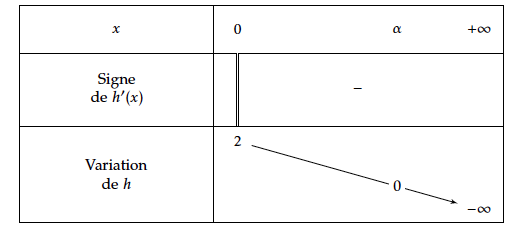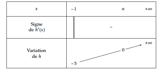 - En déduire que l'équation $h(x) = 0$ a une solution unique $\alpha$ dans $[- 1 ; +\infty [$ .