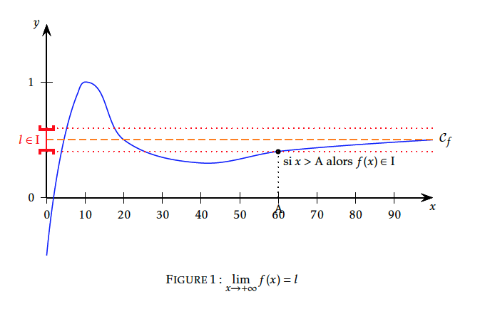 Soit $l$ un réel. Dire que $f(x)$ a pour limite $l$ au voisinage de $+\infty$ signifie que tout intervalle ouvert contenant $l$ contient aussi toutes les valeurs de $f(x)$ pour x assez grand.