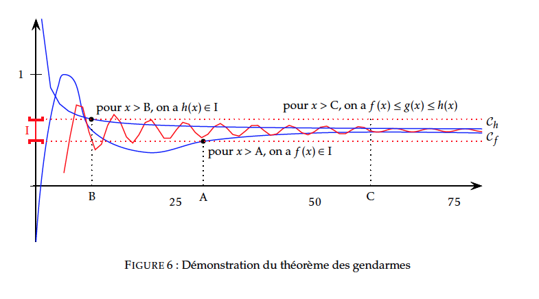 - Démontrer le théorème « des gendarmes » : soient $f,~g$ et $h$ trois fonctions définies sur $[a~;~+ \infty[$ et $\ell$ un nombre réel. Si $g$ et $h$ ont pour limite commune $\ell$ quand $x$ tend vers $+ \infty$, et si pour tout $x$ assez grand $g(x) \leqslant f(x) \leqslant h(x)$, alors la limite de $f$ quand $x$ tend vers $+ \infty$ est égale à $\ell$.