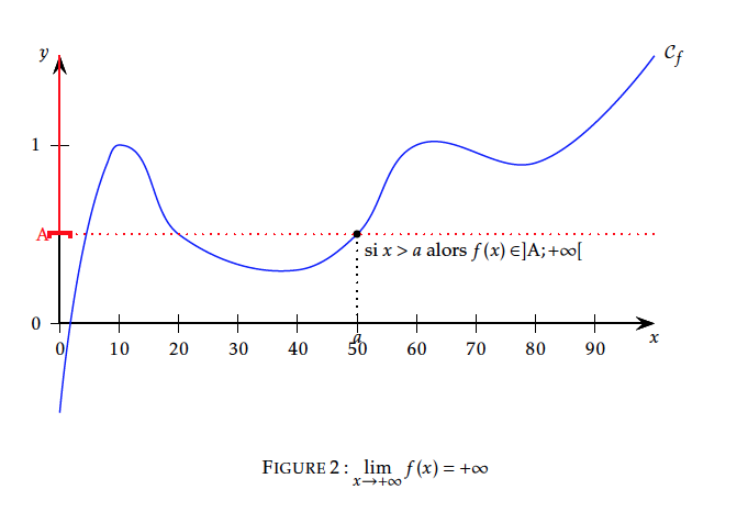 Dire que $f(x)$ a pour limite $+\infty$ (resp $-\infty$) au voisinage de $+\infty$ signifie que tout intervalle ouvert de la forme $]A;+\infty[$ (resp. $]-\infty;-A[$) contient aussi toutes les valeurs de $f(x)$ pour $x$ assez grand.