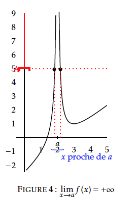 [Limite infinie en $a$] Dire que $f(x)$ a pour limite $+\infty$ (resp. $-\infty$) au voisinage de $a$ signifie que tout intervalle ouvert de la forme $]A;+\infty[$ (resp. $]-\infty;-A[$) contient aussi toutes les valeurs de $f(x)$ pour $x$ assez proche de $a$.