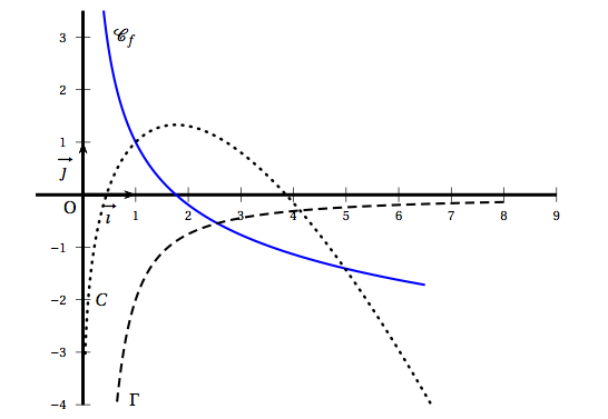 - Indiquer laquelle des deux courbes $C$ et $\Gamma$ représente graphiquement $f'$. Justifier.