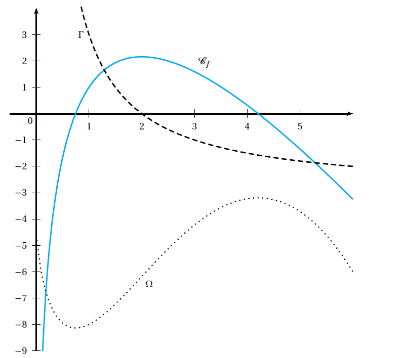 Sur le graphique ci-dessous, on a tracé $\mathcal{C}_{f}$ (trait plein) ainsi que les courbes $\Gamma$ et $\Omega$. L'une de ces deux courbes est la représentation graphique de la fonction dérivée $f'$ de $f$ et l'autre représente une primitive $F$ de $f$.