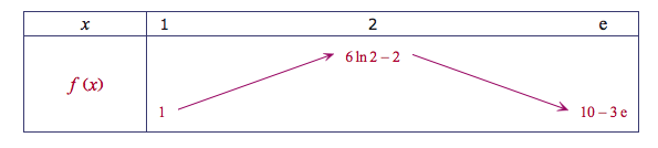 D'après les variations de la fonction $f$, la fonction $f$ admet un maximum pour $x=2$ et $f(2)=6\ln2-2$.